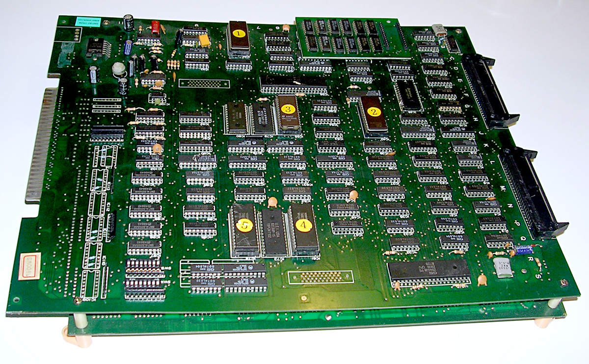 Action-packed, fun shooting fun for two! What a great idea, combining a sidescrolling shooter (heli/player 1) with the Rygaresque Tecmo jump/attack gameplay (jeep/player 2). The team that whipped up this concept should get a prize! My very first PCB. Bought from the US and A on eBay.